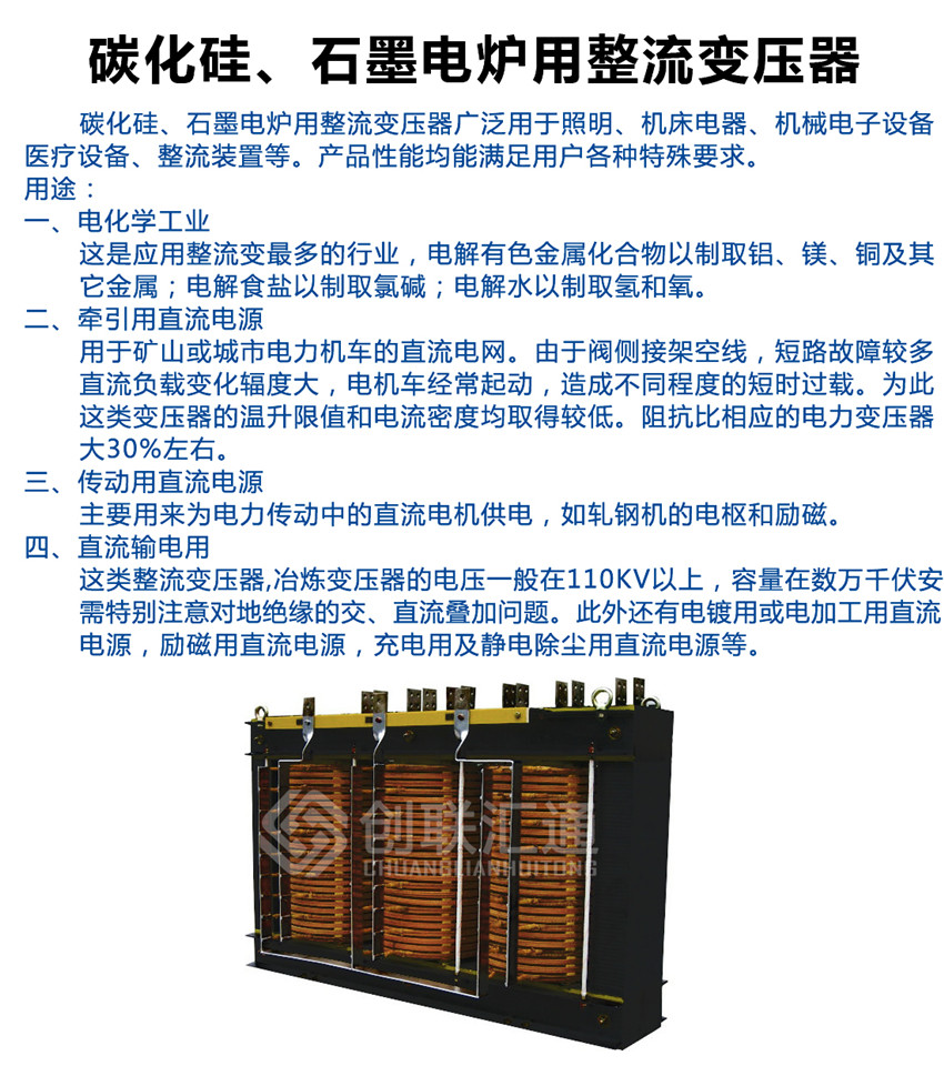碳化硅、石墨電爐用整流變壓器的電壓一般在110kV以上,容量在數萬千伏安。需特別注意對地絕緣的交、直流疊加問題。此外還有電鍍用或電加工用直流電源,勵磁用直流電源,充電用及靜電除塵用直流電源等。